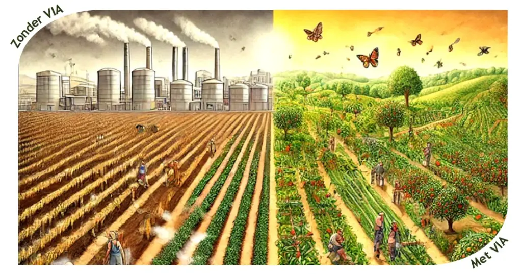 Stel je een landschap voor dat niet is uitgemolken, maar opgebouwd. Waar diversiteit geen uitzondering is, maar de norm. Waar bomen, gewassen, bloemen en bijen samen een voedend systeem vormen. Geen lijnrechte rijen, maar lagen die elkaar versterken. Geen uitputting, maar regeneratie. Dát is hoe een permacultuur-maatschappij werkt. En dat is wat VIA mogelijk maakt.